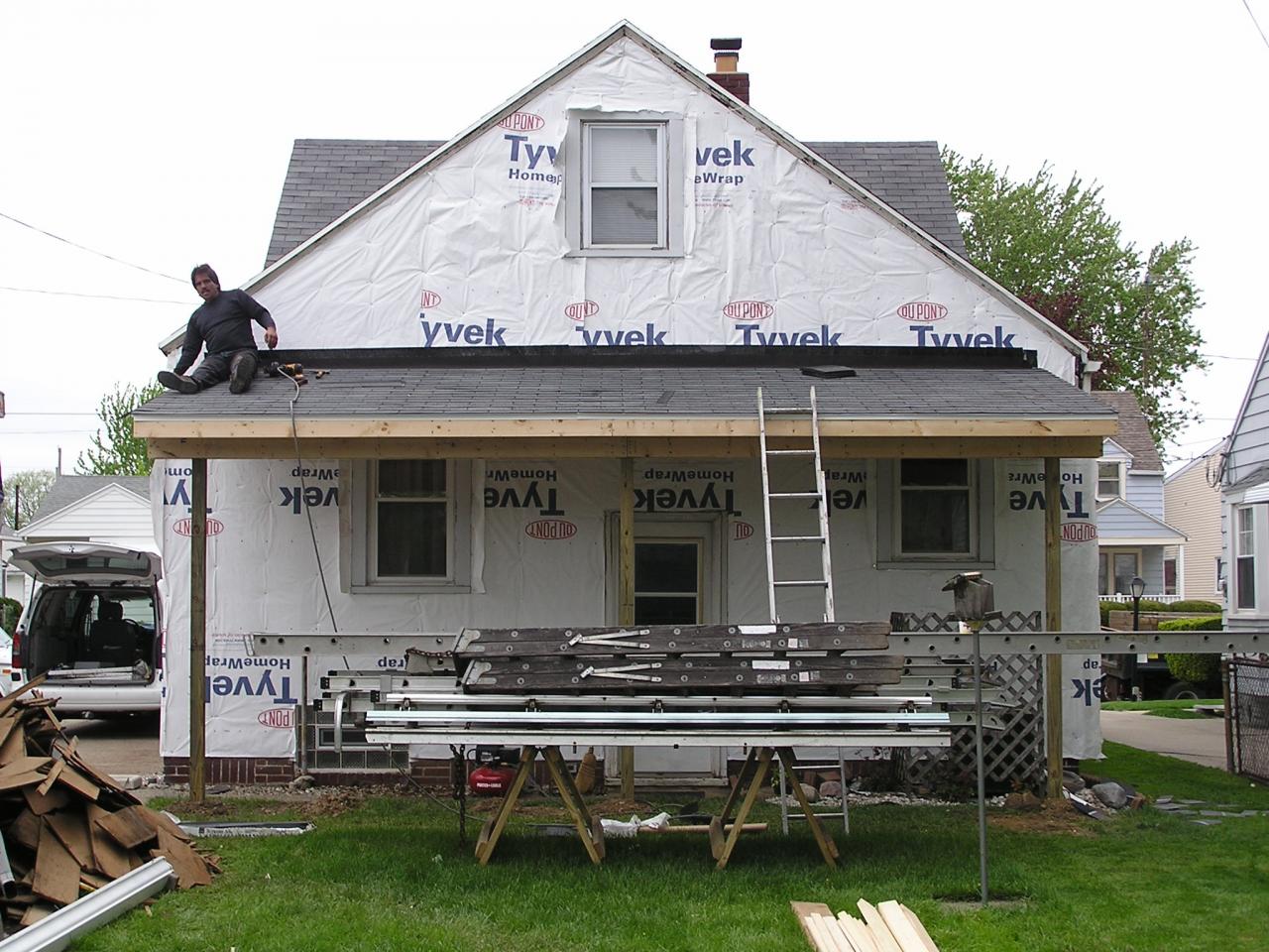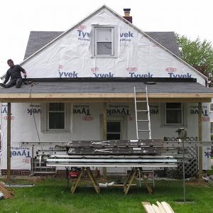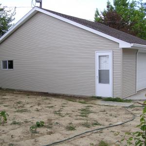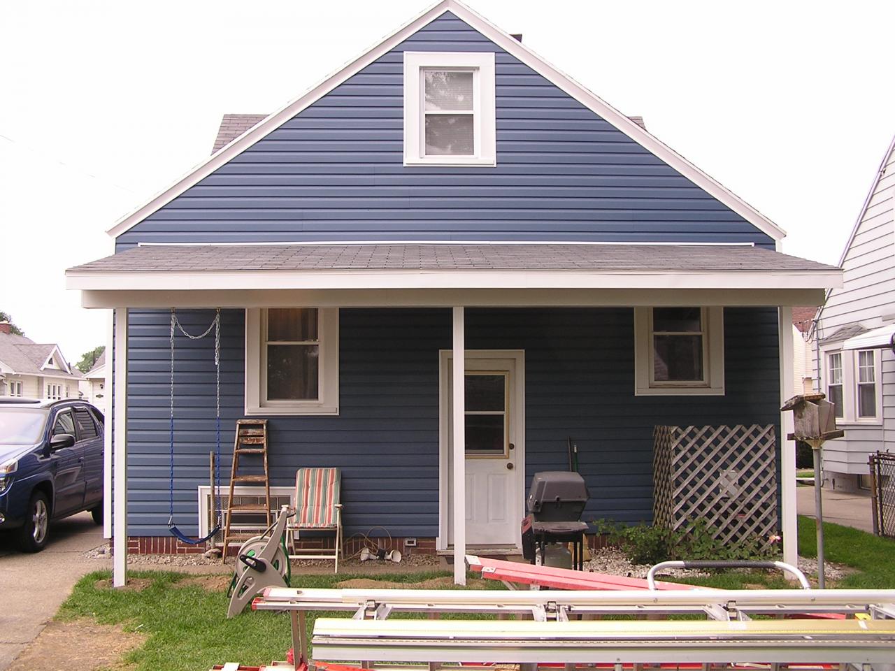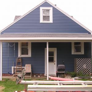 This is the house after we installed Royal Journeymen vinyl siding. Before we installed the siding we installed fan fold underlayment, then wrapped the house with Dupont Tyveck housewrap.
